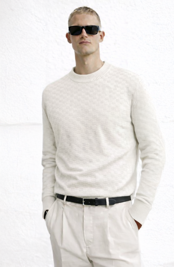 A refined essential for modern wardrobes, this men’s textured knit sweater combines comfort with understated elegance. Designed with a subtle woven pattern, a classic crew neckline, and a regular fit, it’s perfect for smart-casual styling. Easy to layer or wear on its own, this sweater delivers warmth without bulk, making it ideal for everyday wear, work, or relaxed evenings.